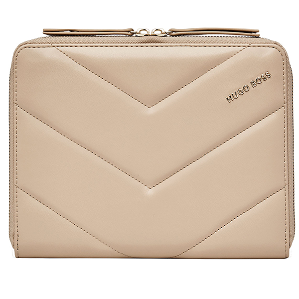 Подписани са с красива златиста плоча с лого на HUGO BOSS, а повърхността им е ватирана с геометричен и графичен модел, което ги прави едновременно модерни и женствени. Перфектният ежедневен спътник, позволяващ да си водите бележки върху хартиения блок, но също така разполагащ с разкошен интериор, за да организирате всичките си документи. Линията "Triga" е перфектна за смесване и съчетаване в комбинации, които отговарят на вашия вкус, за създаване на непретенциозни, но изискани подаръчни комплекти.