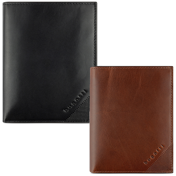 - Лого на марката Bugatti, щамповано в кожата в предната част на портфейла