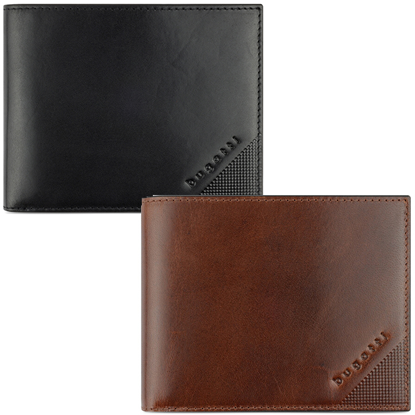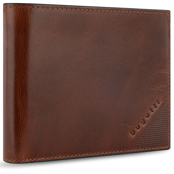 • Лого на марката Bugatti, щамповано в кожата в предната част на портфейла