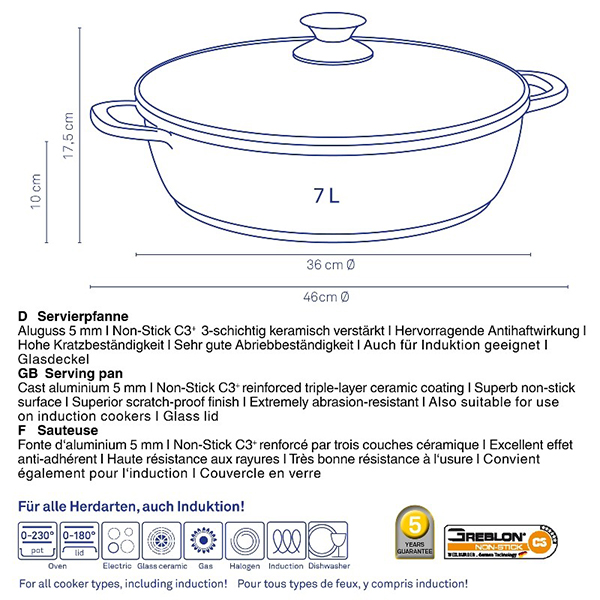 - Материал: лят алуминий, незалепващо 3-слойно покритие