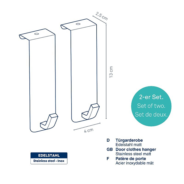 Създайте допълнително пространство за окачване в дома си. Закачалките могат лесно да бъде монтирани, като ги поставите на всяка врата (с дебелина 2 см. в горния ръб). Вратите са защитени от надраскване с дунапрен от вътрешната страна на закачалката. Това превръща вратата в практична и атрактивна помощ в организацията на дома, както и спестяващо място решение.