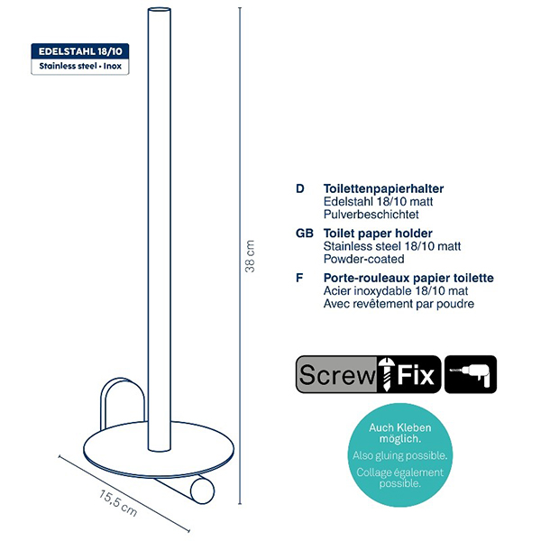 Поставката за тоалетна хартия впечатлява с модерния си матов вид, който се вписва перфектно във всеки съвременен интериор. Изработена от висококачествена неръждаема стомана и с височина от 38 см, тя предлага достатъчно място за до три ролки тоалетна хартия. Внесете стил и изтънченост във вашата баня със аксесоарите от серия Alessio.