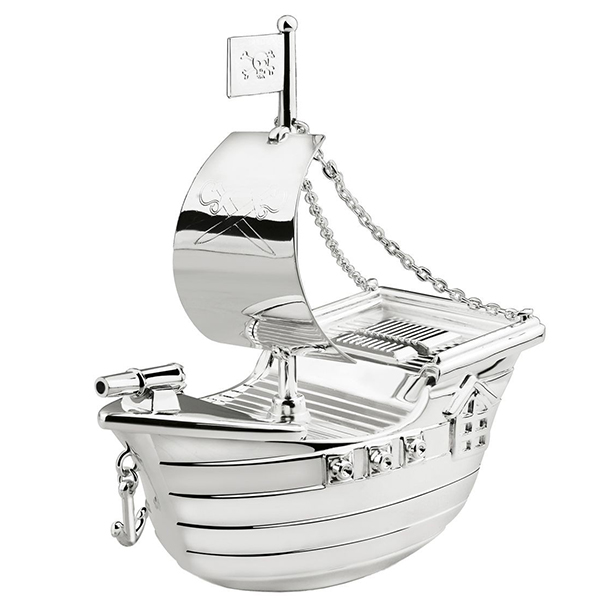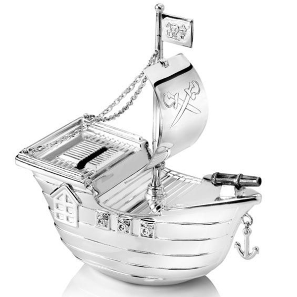 Касичка във формата на пиратски кораб, посребрена и лакирана. Може да бъде гравирана, което я прави идеална като личен подарък (за раждане, за кръщене, за рожден ден).