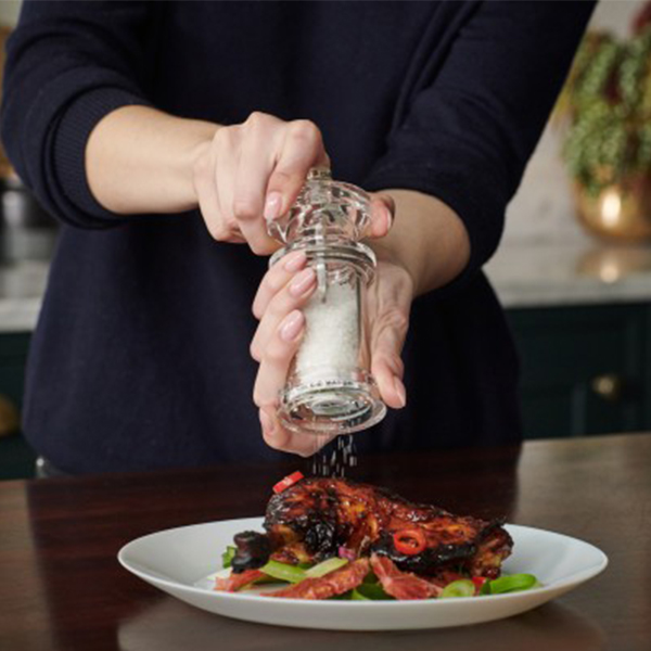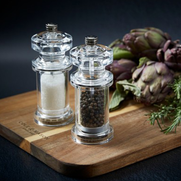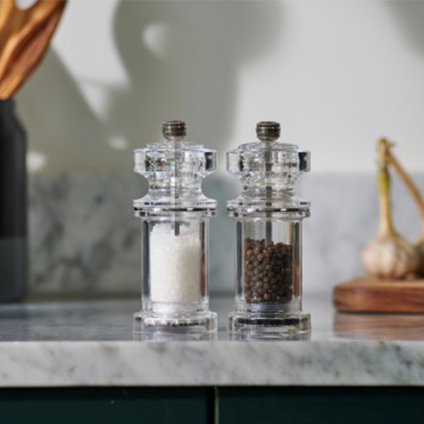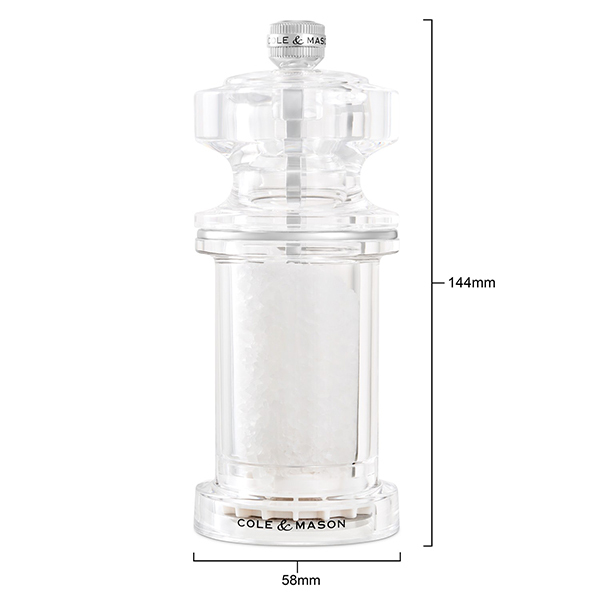 Изработена от акрил и висока 144 мм, със своите квадратни ръбове и елемент от неръждаема стомана, мелницата 605 има съвременен, но класически дизайн. Нейният иновативен дизайн и първокласно качество са синоним на марката Cole & Mason. Универсалността на акрила прави тази мелница идеална както за традиционни, така и за модерни кухни. Лесно регулирайте смилането от фино към едро, като завъртите копчето в горната част на мелницата. Всяка мелничка се предлага частично пълна, а комплектите идват опаковани. Почиствайте с микрофибърна кърпа, за да Ви служат максимално дълго. Механизмите за смилане (добре заточена антикорозионна керамика за мелничката за сол, патентован Precision+ механизъм от въглеродна стомана мелничката за пипер) Ви позволяват да подправяте с увереност, знаейки, че ще постигнете високо качество всеки път.