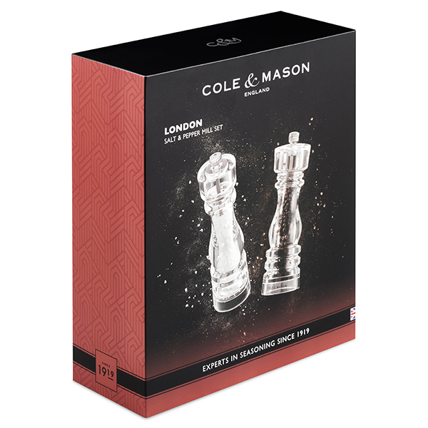 Мелничките LONDON на COLE & MASON едновременно почитат историята и гледат към бъдещето с класически, но съвременен дизайн. Те са стилно допълнение както към традиционните, така и към модерните кухни. Лесно регулирайте едрината на смилане от фино към едро, като завъртите копчето в горната част на мелницата. Изработени са от висококачествен акрил с метални акценти. Мелничките се предлагат частично пълни. Почиствайте с микрофибърна кърпа, за да Ви служат максимално дълго. Механизмите за смилане (добре заточена антикорозионна керамика за мелничката за сол, патентован Precision+ механизъм от въглеродна стомана мелничката за пипер) Ви позволяват да подправяте с увереност, знаейки, че ще постигнете високо качество всеки път.
