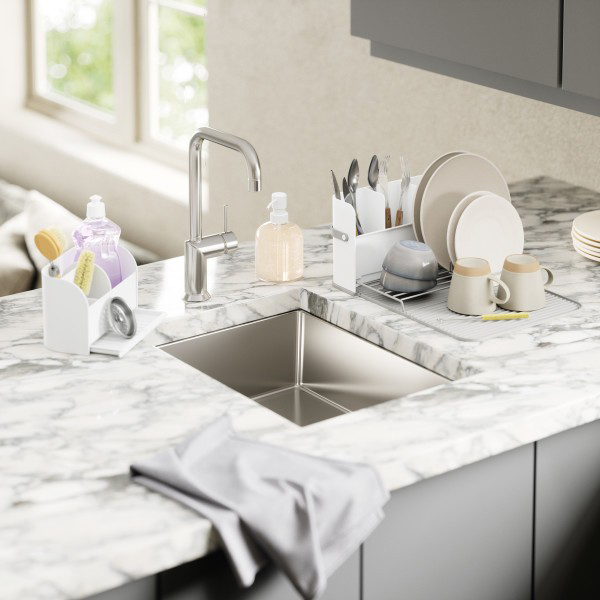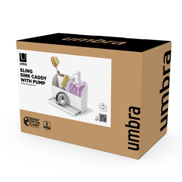 Органайзер SLING е проектиран да разчисти зоната около вашата мивка и да направи миенето на съдове лесно и приятно. SLING има място за съхранение (на четки и гъби) с подвижен разделител, а също и диспенсър за миещ препарат. Подвижна тавичка улеснява дренажа, но служи и като допълнително място за съхранение.