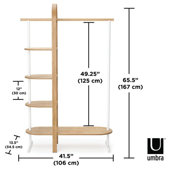 Закачалката за дрехи и аксесоари BELLWOOD съчетава меки извивки с акценти от огънато дърво. Тази модерна и многофункционална закачалка е идеална за организиране на вашите дрехи, обувки, чанти и аксесоари. С четири рафта спестяващи място и интегриран стоманен прът, BELLWOOD може да се използва във вашата спалня, перално помещение, килер, антре и други Лесна за сглобяване, закачалката се доставя с целия необходим хардуер и инструкции.
