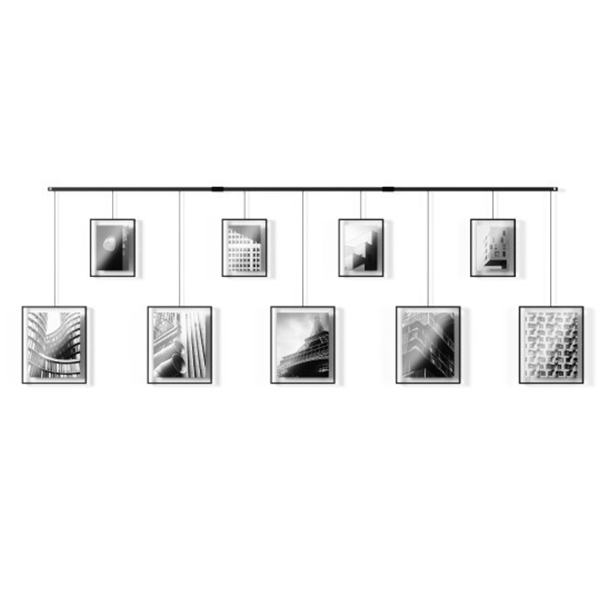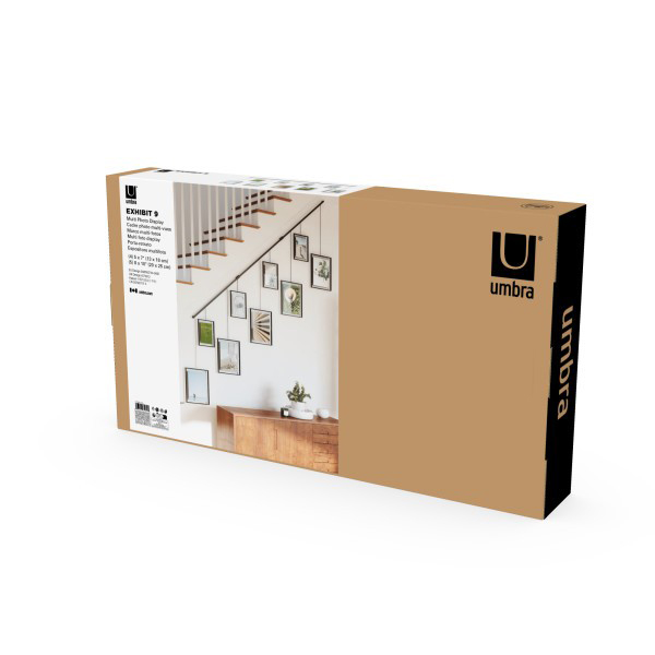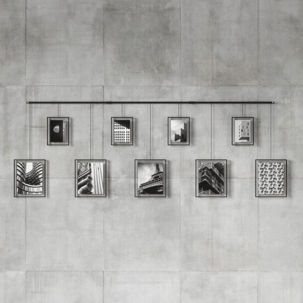 Експозиционният фотодисплей разполага с метална греда, която се монтира на стена и метални държачи за девет рамки за снимки, които са в два размера. EXHIBIT e чудесно допълнение към вашето стълбище поради способността му да бъде окачен под ъгъл. Използвайте EXHIBIT, за да зададете декоративен акцент във вашата всекидневна, спалня, антре или офис като подредите любимите си снимки или произведения на изкуството. Рамките за снимки могат да се местят по металната греда, а също и да се завъртат в пейзажна или портретна ориентация. EXHIBIT е красив декор за стена, който ви позволява лесно да сменяте изображенията в деветте рамки. Ще намалите и щетите, причинени от окачването на няколко рамки на стената ви, защото EXHIBIT изисква само четири отвора за винтове, за да окачите девет рамки (включени са и монтажни елементи).