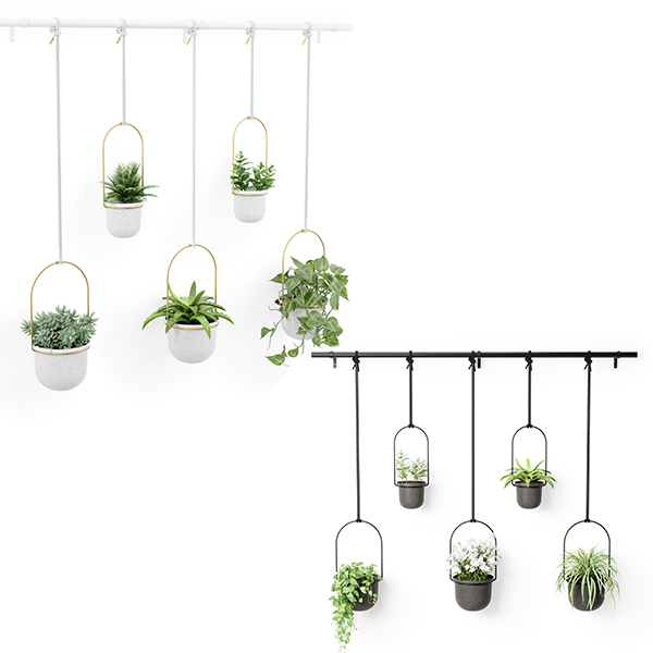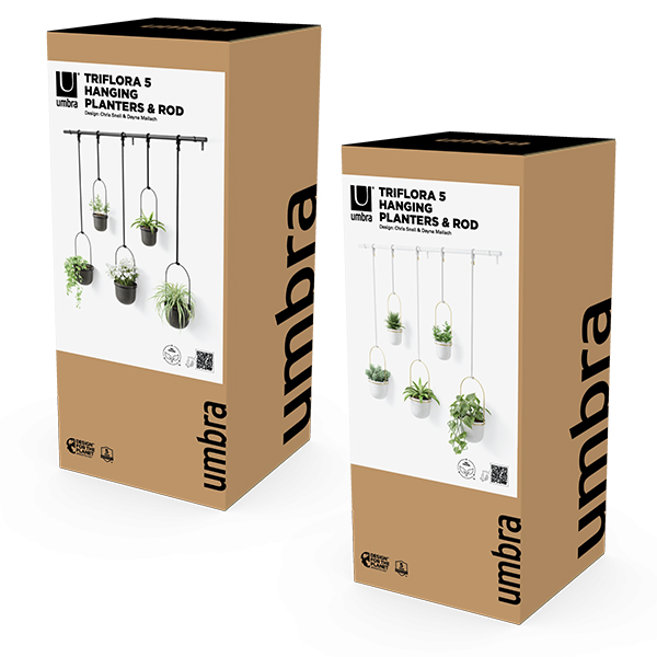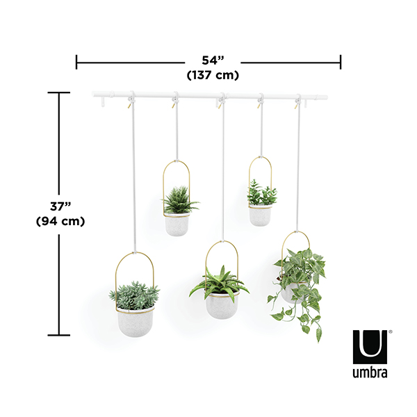 TRIFLORA е комплект от 5 висящи кашпи за стайни растения. Чудесни за билки, кактуси, стайни растения и цветя. TRIFLORA се монтира към стена, таван или към прозорец, като го превръща в идеалното място за отглеждане на растения. Кашпите са направени от издръжлив рециклиран полипропилен и са леки дори след като поставите саксии в тях. Можете да регулирате дължината на въжетата и да ги плъзнете навсякъде по металния прът, за да персонализирате позицията на всяка висяща саксия. Кашпите могат да поберат две стандартни саксии с диаметър 7,6 см и три саксии с диаметър 15 см. TRIFLORA може да се използва и на открито.
