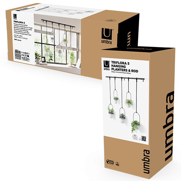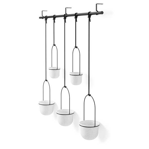 TRIFLORA е комплект от 5 висящи кашпи за стайни растения. Чудесни за билки, кактуси, стайни растения и цветя. TRIFLORA се монтира към стена, таван или към прозорец, като го превръща в идеалното място за отглеждане на растения. Кашпите са направени от издръжлив рециклиран полипропилен и са леки дори след като поставите саксии в тях. Можете да регулирате дължината на въжетата и да ги плъзнете навсякъде по металния прът, за да персонализирате позицията на всяка висяща саксия. Кашпите могат да поберат две стандартни саксии с диаметър 7,6 см и три саксии с диаметър 15 см. TRIFLORA може да се използва и на открито.
