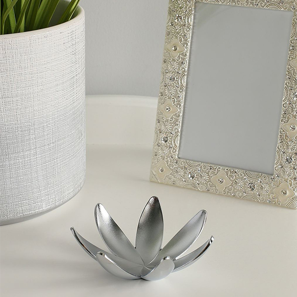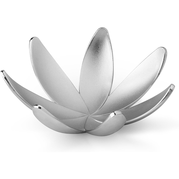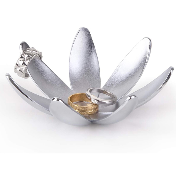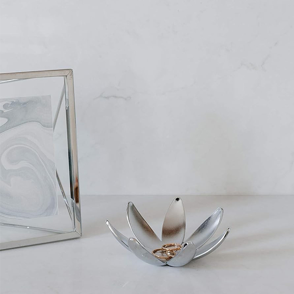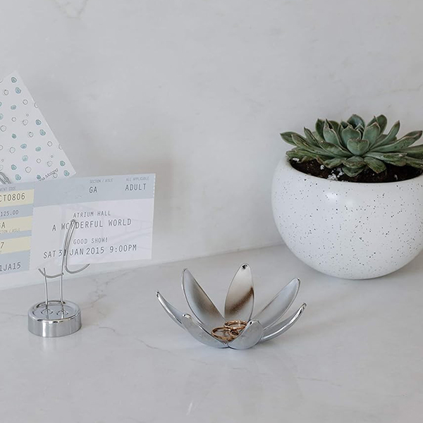 Поставката за пръстени Magnolia от марката Umbra е елегантно метално цвете, привлекателно със своята елегантност. Закачете пръстените на венчелистчетата му или ги поставете в средата. Така те винаги ще бъдат на едно място. Меката подложката в основата на стойката ще предпази повърхностите от надраскване.