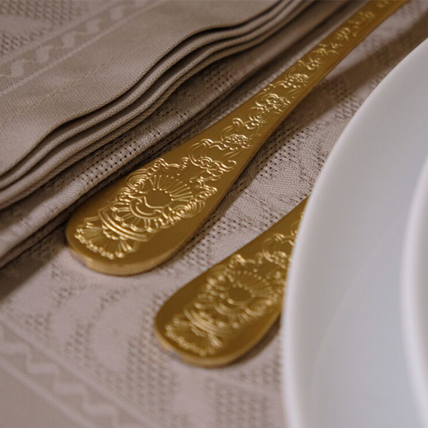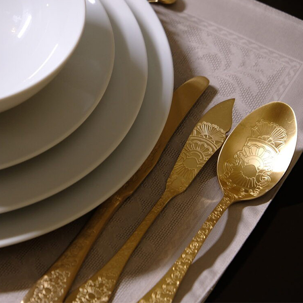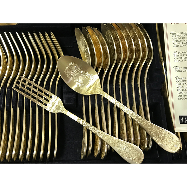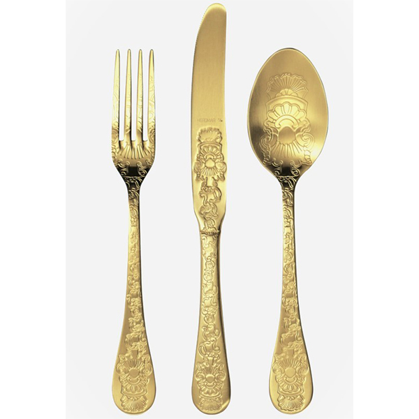Позлатени прибори с 24 карата злато: Приборите за хранене със златно покритие имат покритие с дебелина от 3 или 4 микрона 24 карата злато Всички прибори със златно покритие е препоръчително да бъдат почиствани в съдомиялна машина и НИКОГА с абразивни или агресивни препарати, както и груби и драскащи гъби. Покритието е биосъвместимо, тествано и одобрено за безопасност при контакт с храна Пазете приборите със златно покритие и ги поддържайте с внимание и грижа, за да запазите добрия им външен вид. Плътността на цвета на златното покритие може леко да се промени, според начина на използване и от околната среда, където се съхраняват. Приборите трябва винаги да бъдат добре почистени и подсушени, за да се предотврати образуването на петна. HERDMAR не гарантира замяна на позлатени прибори - 24 карата злато, освен ако не се установи дефект, причинен при производство или от суровина.
