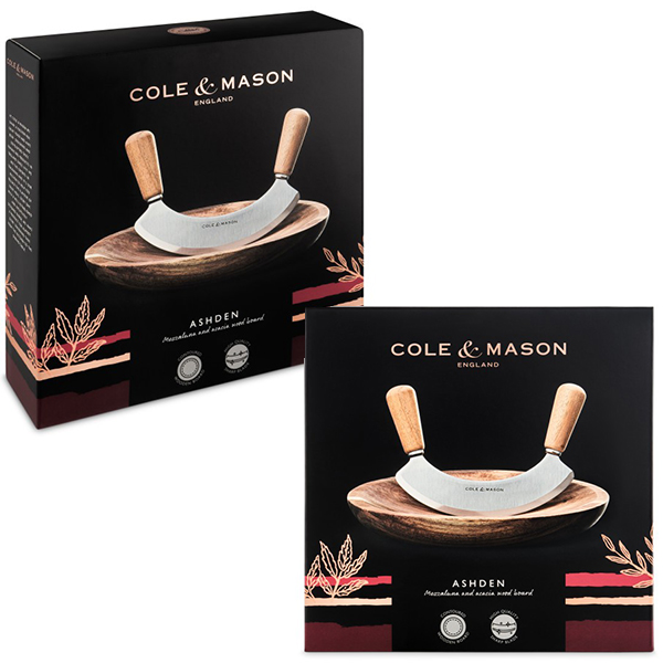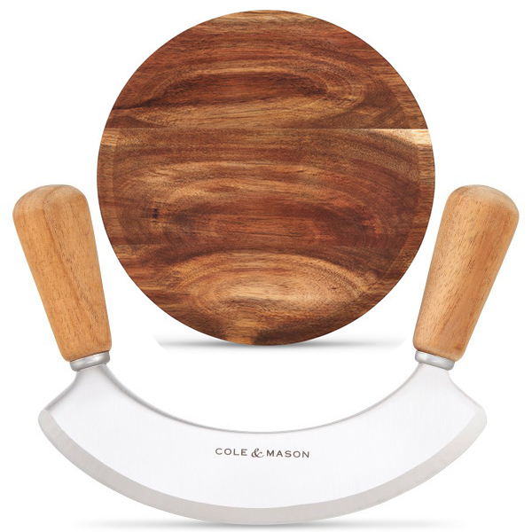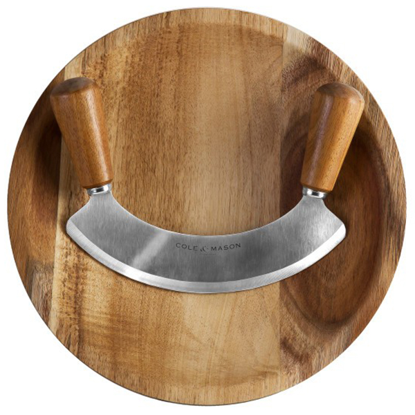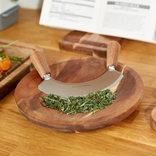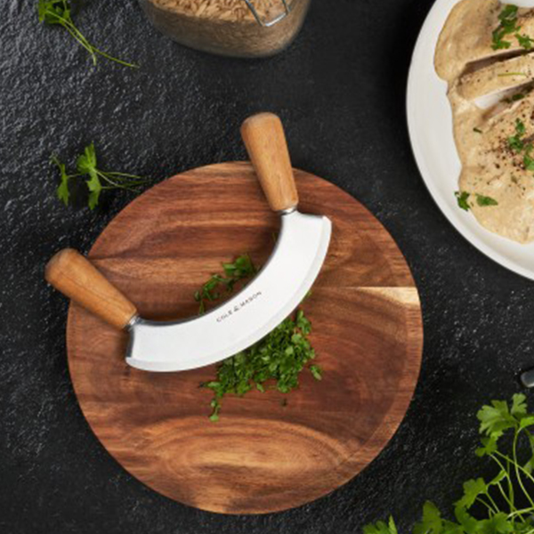 Експертно проектиран за превъзходно и бързо нарязване. Извивката на дъската Cole & Mason е оформена така, че да позволява супер-плавно движение на кълцане, а заоблените дървени дръжки на ножа Mezzaluna (мезалуна) са изработени за максимален комфорт. Като една от най-бързо растящите екзотични твърди дървесини в света, акацията е интелигентният, устойчив избор за приготвяне на храна, осигурявайки здрава, дълготрайна повърхност за рязане. Изключително издръжливо, дървото е богато на естествени масла, които му помагат да остане здраво с течение на времето, докато естественото му неправилно зърно му придава блестяща красота. След като подготовката приключи, дъската може да се използва като съд за сервиране. Лесен за почистване: просто измийте на ръка и оставете да изсъхне на въздух.