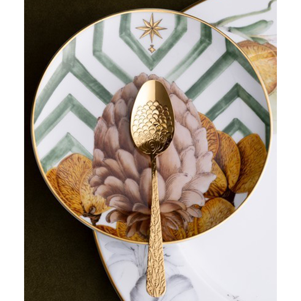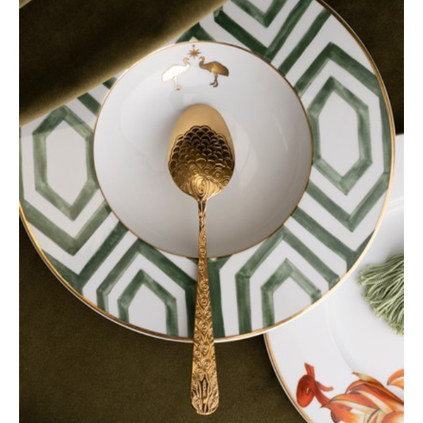 Екзотиката на пауна е пренесена в този уникален комплект от прибори за хранене. С плавни линии и балансиран профил, моделът Pavo отразява изобилие и ексцентричност, носейки на масата тропическо настроение. Позлатени прибори с 24 карата злато: Приборите за хранене със златно покритие имат покритие с дебелина от 3 или 4 микрона 24 карата злато; Всички прибори със златно покритие е препоръчително да бъдат почиствани в съдомиялна машина и НИКОГА с абразивни или агресивни препарати, както и груби и драскащи гъби. Покритието е биосъвместимо, тествано и одобрено за безопасност при контакт с храна; Пазете приборите със златно покритие и ги поддържайте с внимание и грижа, за да запазите добрия им външен вид. Плътността на цвета на златното покритие може леко да се промени, според начина на използване и от околната среда, където се съхраняват. Приборите трябва винаги да бъдат добре почистени и подсушени, за да се предотврати образуването на петна. HERDMAR не гарантира замяна на позлатени прибори - 24 карата злато, освен ако не се установи дефект, причинен при производство или от суровина.