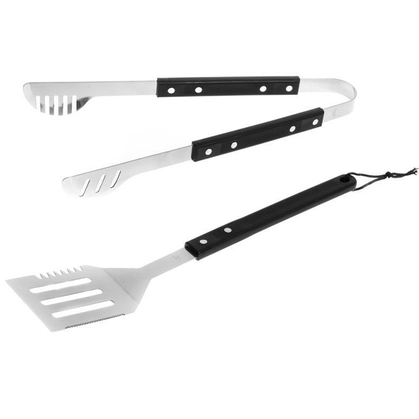 Комплект от 2 части за барбекю с изящен дизайн - щипки и шпатула. Перфорираните прибори позволяват на излишните сокове или мазнина да се отцедят от храната. Кукичките на приборите Ви осигуряват лесно съхранение - директно на Вашето барбекю. Приборите са изработени от неръждаема стомана с дръжки от полипропилен.