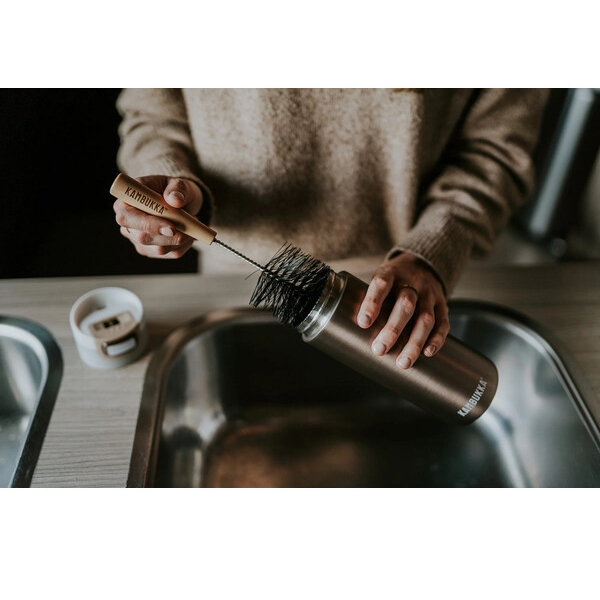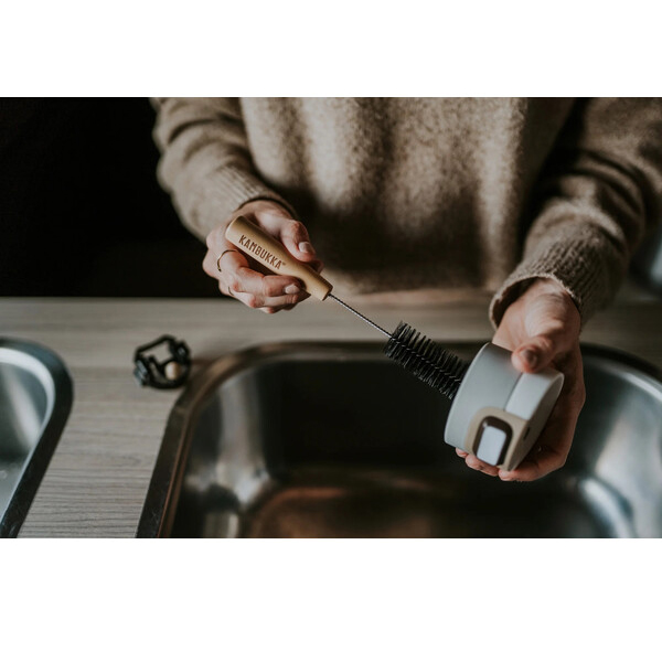 Искате ли искрящо чиста бутилка? Измивайте добре вашата Kambukka между употребите. Напълнете я до горе с гореща сапунена вода и използвайте голямата четка за почистване. За да направите бутилката си отново блестяща и като нова, създадохме и четка, която да влезе във всички малки ъгли.