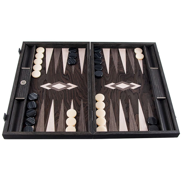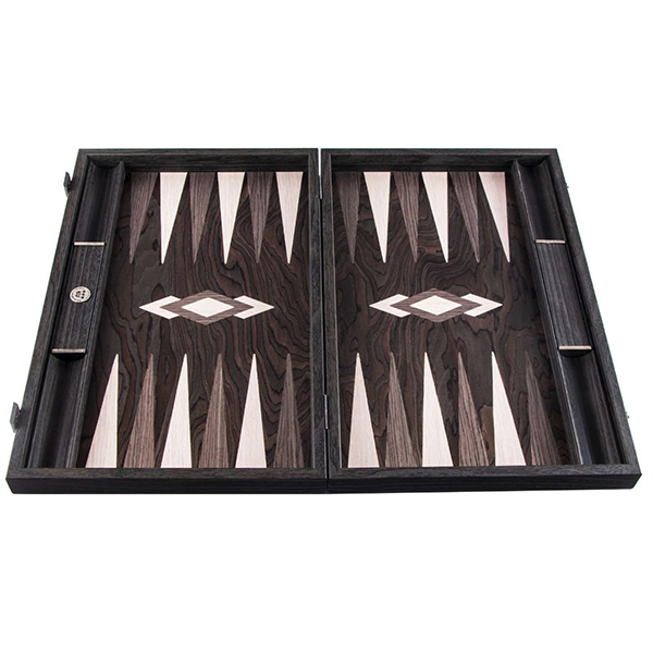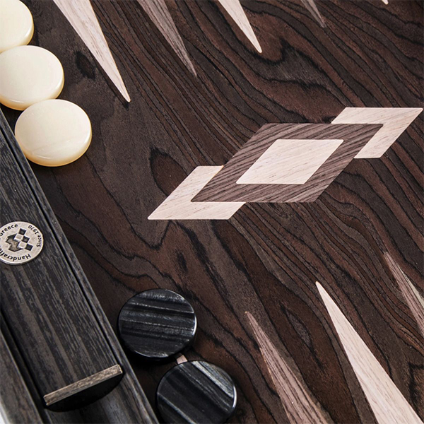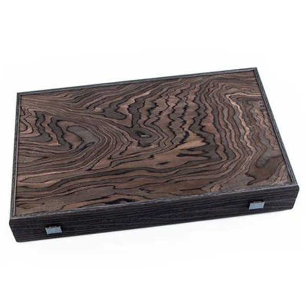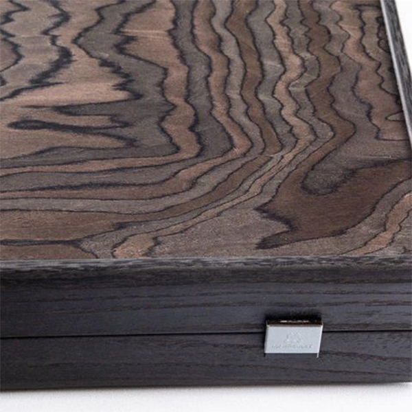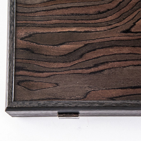Фурнирът от абаносовият дървесен композит е почти черен на цвят с контрастни нюанси на сивото. Дървото съдържа шарки от подобни на пламък фигури, които са резултат от неправилнат вълнообразна структура. Игралното поле е комбинация от абаносово дърво с инкрустирани капии от сиво и дъб. Таблата е ръчно изработена чрез техника "Интарзия", наричана също "Инкрустация", при която различните видове фурнир се режат на фигури от майстори артисти. Впоследствие фигурите се подреждат и влагат една в друга. По този начин се получава игрално поле с невероятна красота. *Забележка! Тъй като при направата на този продукт са използвани висококачествени естествени материали, всяка една табла е уникална и различна от другите. Снимката е илюстративна, като показва цветове и разположение на фурнирите. Продуктът, който ще получите може да се различава от снимката по фладер (шарка на дървесината) и нюанс на цвета.
