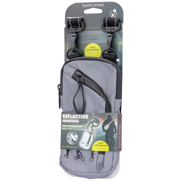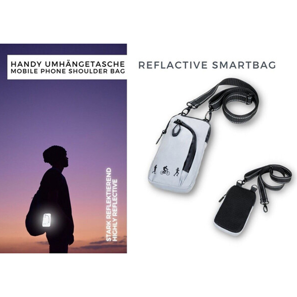 REFLACTIVE SMARTBAG е поразително впечатляваща. Отразяващият материал на чантата за смарт мобилен телефон гарантира, че няма да останете незабелязани. Истински фактор за безопасност при джогинг, колоездене или ходене. На закрито, на открито и навсякъде в свободното ви време. Обикновените смартфони се побират в основното отделение (подплатено, мрежа на гърба). В предното отделение можете да поставите например слушалки, карти, ключове и други подобни. Устойчив е на пръски и е с гумирани ципове.