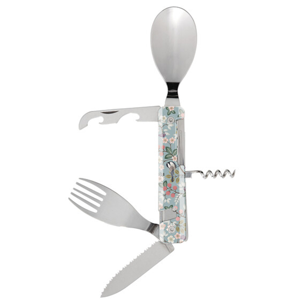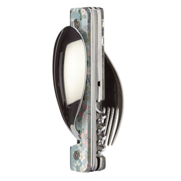 - Състои се от голяма лъжица, вилица с 5 зъба, нож с микро набраздено острие, тирбушон с 4 спирали, отварачка за консерви и отварачка за бутилки