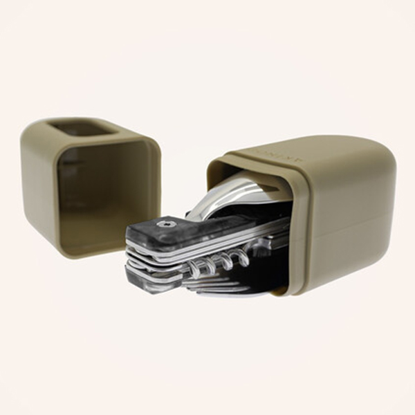 - Състои се от голяма лъжица, вилица с 5 зъба, нож с микро набраздено острие, тирбушон с 4 спирали, отварачка за консерви и отварачка за бутилки