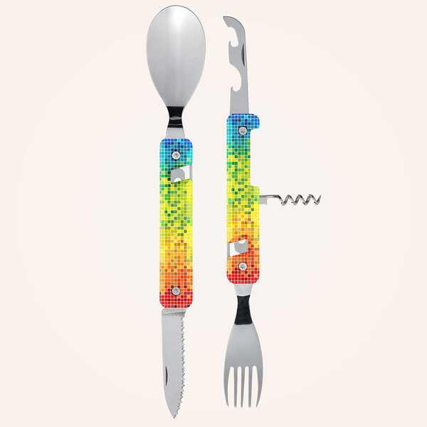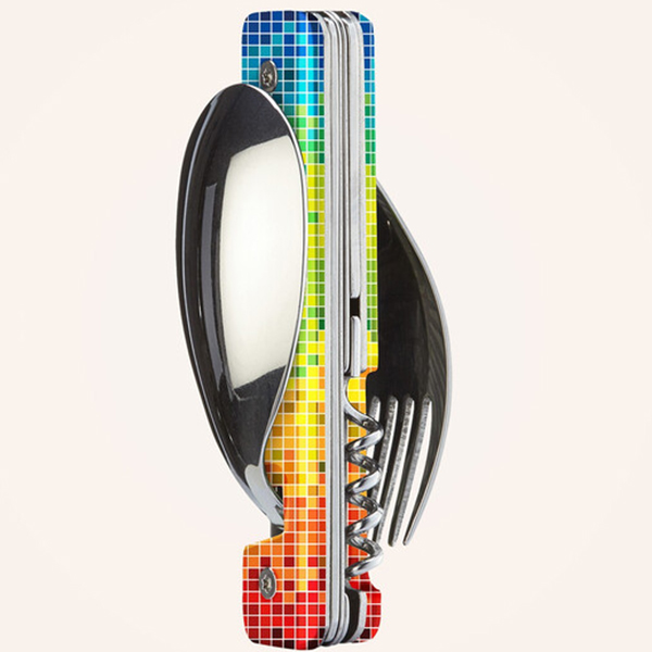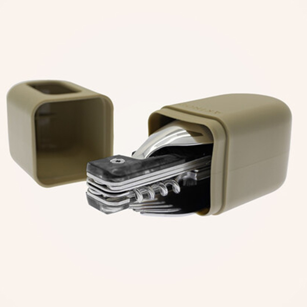 - Състои се от голяма лъжица, вилица с 5 зъба, нож с микро набраздено острие, тирбушон с 4 спирали, отварачка за консерви и отварачка за бутилки