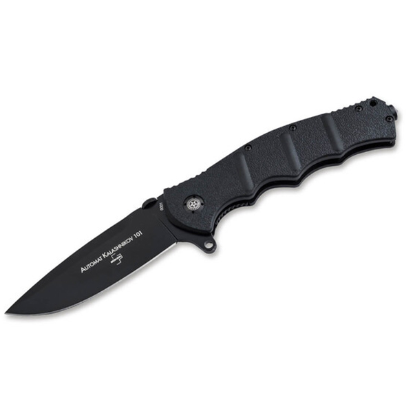 Boker Plus AK-101 2.0 от серията "Калашников" е пълноценен тежък нож, който е подходящ както за тактическа употреба, така и за употреба на открито. Дръжката, изработена от високоякостна синтетика, лежи сигурно в ръката благодарение на структурираната повърхност, типичните напречници и вдлъбнатините за пръстите. Вдлъбнатината в областта на опората за палеца също гарантира контролирано рязане. Във версия 2.0 джобното ножче се предлага с черно покритие на острието с капковиден връх, изработено от стомана D2, което може да се отваря лесно дори с ръкавици с помощта на флипера или повдигача за палеца, който може да се достигне от двете страни. Разбивачът на стъкла в края на дръжката разширява още повече спектъра на употреба. Стоманените вложки, монтирани под чирените на дръжката, придават на цялата конструкция необходимата стабилност. Джобното ножче се заключва с надеждната ключалка linerlock.