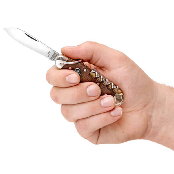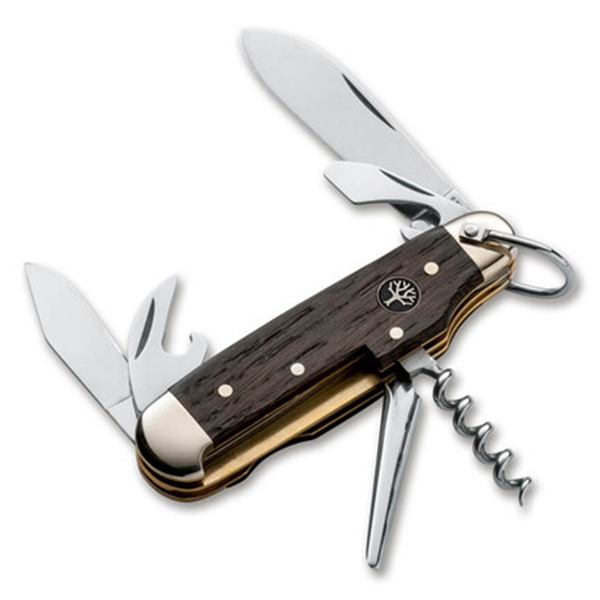 Ножът Boker Camp Knife с шест функции се произвежда ръчно от 1869 г. насам в нашата работилница в Солинген. Концепцията, копирана многократно в хода на историята, съчетава множество полезни инструменти във висококачествен джобен нож. Той се произвежда по-дълго от всеки друг многофункционален нож. Предлага две остриета, отварачка за консерви, отварачка за бутилки, шило и разширител за кожа, тирбушон и плоска отвертка. И двете остриета са изработени от стомана 4034 - класическата стомана за остриета от Солинген, която съчетава устойчивост на корозия със запазване на режещия ръб и се заточва лесно. Ветеранът от нашата моделна гама е с полирани болстери от никелова сплав и тъмни опушени чирени от местен дъб на дръжката. Благодарение на практичната каишка, ножът може лесно да се прикрепи към чанти или други предмети. Включва висококачествен кожен калъф с верижка.
