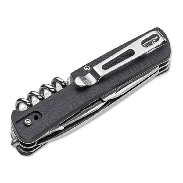С ножа Boker Camp Knife, един от родоначалниците на всички съвременни многофункционални джобни ножове, започва нашта история през 1869 г. След почти 150 години успешно присъствие на пазара дойде време да превърнем тази доказана концепция в модерен нож. Модернизираната конструкция, която се основава на солидни стоманени вложки, е вградена в скосените чирени на дръжката, изработени от черен G10. Шведската стомана Sandvik 12C27, с твърдост по Rockwell 58-60 HRC, осигурява изключителна устойчивост на шлифованото острие. Висококачествената изработка, с плавно действие на острието и оптимизирана оперативност, са доказателство за първокласното качество на нашите Boker Plus Tech Tools. Ножът е екипиран и със следните инструменти: разбивач на стъкла, плоска отвертка с отварачка за бутилки и инструмент за оголване на проводници, малко назъбено острие с плоска отвертка, тирбушон, отвор за ремъче, клипс.