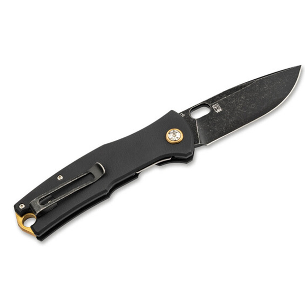 Проектираният от Йеспер Вокснаес нож Boker Plus Fieldfolder се справя с всички задачи за рязане без усилие и убеждава както в ежедневието, така и при тежка употреба. Надеждният джобен нож е снабден с тъмно острие от D2 със сатениран финиш, което се управлява с отвор за палеца и се заключва със здрав лайнерлок. Подложките, вградени във впечатляващите текстурирани черни чирени на дръжката от G10, са изработени от неръждаема стомана, а частично откритият дистанционер е изработен от месинг. Добавения пръстен в месингов цвят около декоративния въртящ се винт добавя допълнителен визуален акцент. Нарезите около опората за палеца и в края на дръжката повишават безопасността при работа. С отвор за каишка, клипс за носене и висококачествен найлонов калъф за съхранение.