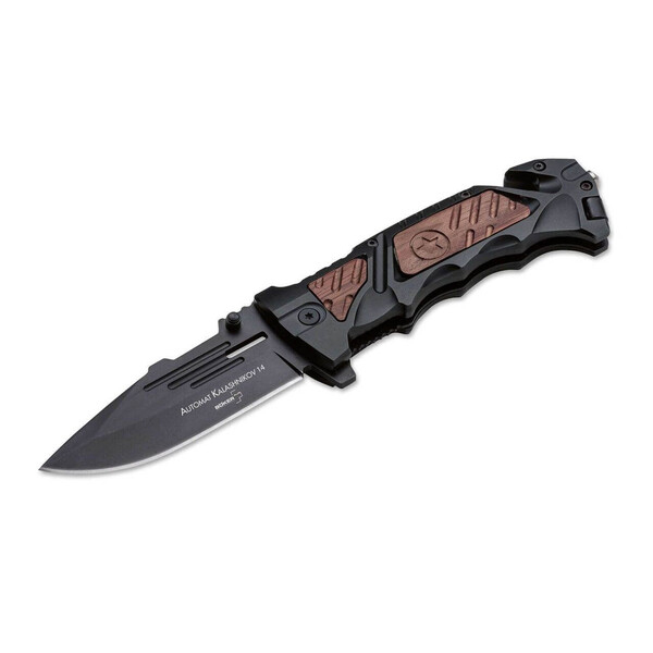 Boker Plus KAL-14 от серията Калашников продължава успешната серия и осигурява напълно уникална визуална привлекателност със своите дървени инкрустации в алуминиевата дръжка. Острието се отваря с флипер или щифт за палеца и се заключва с Linerlock система. Инструментът за разбиване на стъкло и инструментът за рязане на колани завършват оборудването. Острието е от стомана 440C.