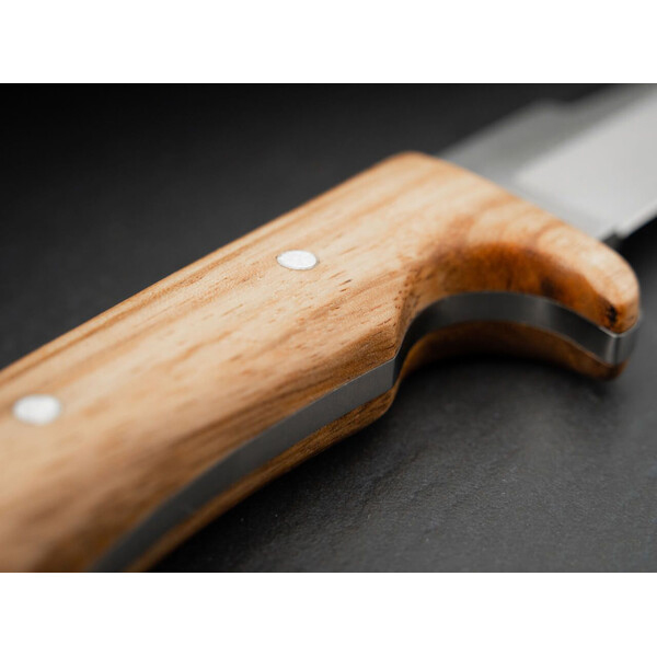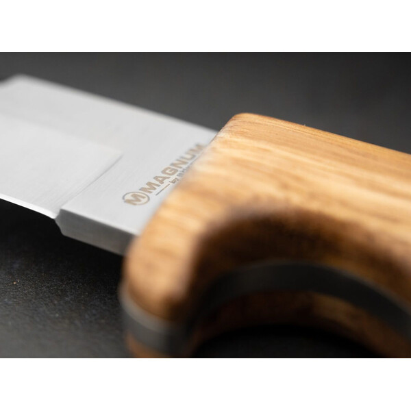 Доказаният Magnum Elk Hunter е надежден туристически нож и впечатлява с идеалната си дължина на острието. Подходящ както в дивата природа, така и в ежедневието. Визията и функционалността характеризират този нож с острие от неръждаема стомана 440A. Острието е със сатениран финиш и е впечатляващо шлифовано. Удълженото рикасо на гърба на острието придава на ножа модерен вид. Здравата пълен танг конструкция е снабдена с ергономично оформени чирени на дръжката, изработени от Zebrawood, което веднага привлича окото. Изразеният предпазител за ръката и дълбоката вдлъбнатина за пръстите предотвратяват неволно плъзгане върху острието и по този начин повишават безопасността при работа. Подсиленият отвор в края на дръжката може да се използва за закрепване на ремък или украшение/медальон към ножа. Доставя се с практична кожена кания, която може да бъде удобно закрепена към колан.