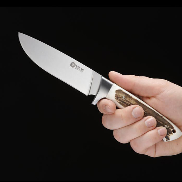Популярният Boker Arbolito Hunter е надежден нож за лов и разходка на открито със здрава пълен танг конструкция. Високото плоско шлифоване на сатенираното острие от стомана N695, осигурява балансирани свойства на рязане, докато извитият болстер от неръждаема стомана придава на Hunter хармонична и приятна линия. Чирените са изработени от селектирани еленски рога. С отвор за ремък и висококачествен калъф за колан от кафява кожа.