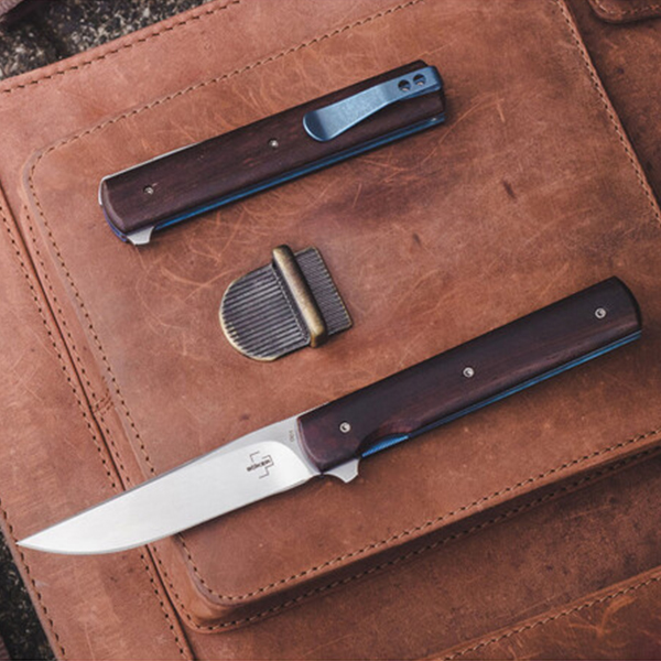 Моделът Boker Plus Urban Trapper, проектиран от Брад Зинкер, е оборудван с надежден лайнерлок в тази малко по-осезаема версия и по този начин се предлага с допълнителен заключващ механизъм. Елегантният джобен нож е оборудван с острие от VG-10, което е с финиш hairline и се отваря с флипер със сачмени лагери. Чирените на дръжката от тъмно дърво кокоболо са с фина текстура и подчертават благородния характер на джобното ножче. Стабилните титанови вложки са анодизирани в синьо и по този начин съответстват на цвета на клипса за носене, който също е изработен от титан. С висококачествен найлонов калъф за съхранение.