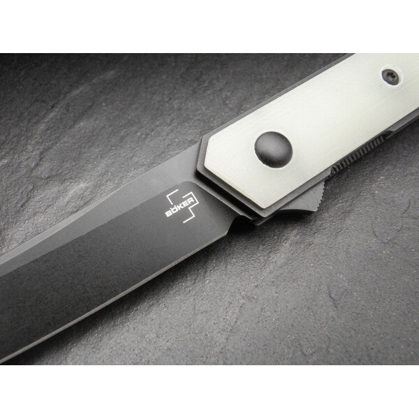 Тънкият дизайн и изключителният избор на материали превръщат Boker Plus Kwaiken Air в елегантно съчетание между сгъваем и тактически нож. За да направи този преход още по-лесен, Kwaiken Air Mini предлага същите изключителни качества като големия си брат със значително намалени и по този начин по-удобни за джоба размери. С праволинейна и практична форма модерният джобен нож се е превърнал в истинска икона. Изчистените линии и тънкият дизайн са допълнително оптимизирани за безкомпромисно намаляване на теглото в олекотената версия, въпреки че ножът все още притежава цялото острие в затворено положение. Флиперът осигурява интуитивна работа и допълнителна безопасност, а лайнерлокът сигурно заключва острието със сачмени лагери, изработено от VG-10 с впечатляващ сатениран финиш. Лекотата на ножчето е подчертана от дръжката, изработена от Natural Jade G10 - полупрозрачен оригинален вариант на устойчивия композитен материал.. Доставя се с отвор за каишка, подвижен клипс и висококачествен найлонов калъф за съхранение.