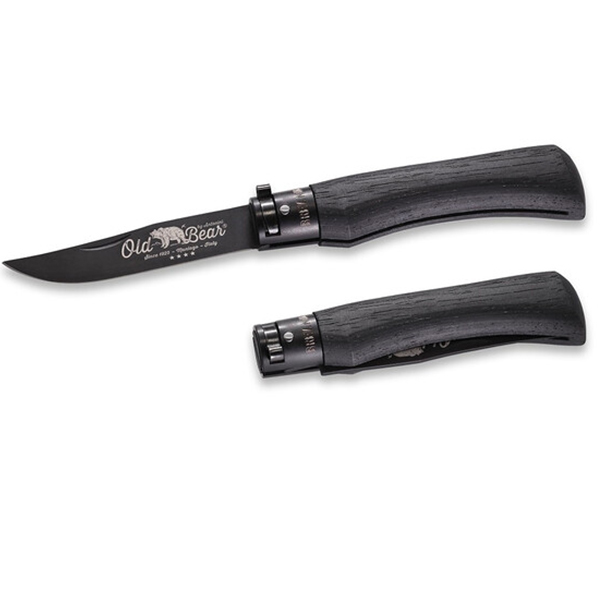 "Old Bear ®" е нашата нова и ексклузивна линия сгъваеми ножове с опростени и ергономични линии. Тя отбелязва и чества 90-годишнината на нашата компания (1925-2015 г.) и умишлено включва производствен процес, включващ високи нива на ръчно производство, квалифицирано и опитно производство.  Дръжката на ножа е от ламинирана дървесина, а острието му е от неръждаема стомана Aisi 420, с черно PTFE покритие, и се заточва с камък от ръцете на опитни и квалифицирани майстори. Ножът "Old Bear ®" е без пружина, което означава, че системата за заключване на острието му е снабдена с масивен предпазен пръстен (патент № 1187282, депозиран през 1985 г. от компанията Todesco от Маниаго, която е активен партньор по този проект), който фиксира дръжката в отворено и затворено положение. Острието на ножа се предлага с нашето лого "Old Bear®". ВАЖНА ЗАБЕЛЕЖКА Този продукт е произведен, като всички използвани суровини са подложени на ръчна обработка и процеси, които правят всеки един нож уникален, оригинален и нестандартен. Всички неравности по повърхността на ножа са допълнителна гаранция за неговата уникалност и ръчни процеси и не влияят на функционалността на ножа.