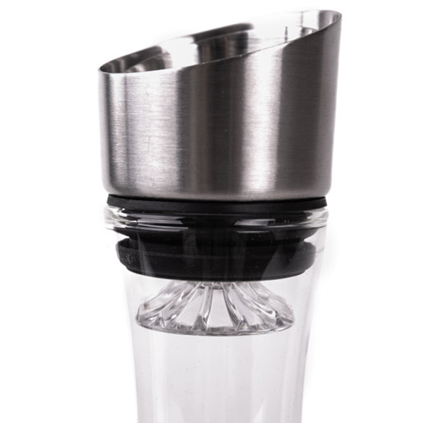 За върховно дегустационно изживяване, оборудвахме този декантер с 3-в-1 стопер, който включва филтър, аератор и наливник. Преди сервиране на виното е важно да го филтрирате. Тази стъпка гарантира кристално чисто вино. Филтърът в нашия стопер задържа всички отлагания в бутилката, осигурявайки качествено вкусово изживяване. Също така е важно виното да се аерира преди сервиране, за да се стимулира букетът и да се насища с кислород. С аератора в нашия декантер виното се разпределя равномерно по стената. Той изважда на преден план нотките и ароматите на вашите най-добри вина, независимо дали са дървесни, плодови, сухи, структурирани или много други. След като виното ви е достатъчно аерирано, остава само да го сервирате. При наливане виното преминава през външната стена, за да се избегне събирането на отлагания от филтъра. Формата на декантера го прави лесен за държане, а наливникът ви позволява да сервирате виното с класа и лекота. Нашите декантери са ръчно изработени от стъклодухачи. Тяхното неподражаемо ноу-хау гарантира качеството на нашите продукти и висококачествен завършек. Всяка бутилка е изработена от 100% кристално стъкло, предлагащо здравина и финес, за да подобрят вкуса на всички ваши напитки. Съвети от производителя: За да поддържате декантера, препоръчваме да го миете на ръка. Избягвайте почистване с абразивни препарати и съдомиялна машина, тъй като те могат да оставят отлагания в пукнатините на планината.