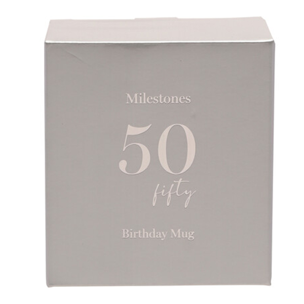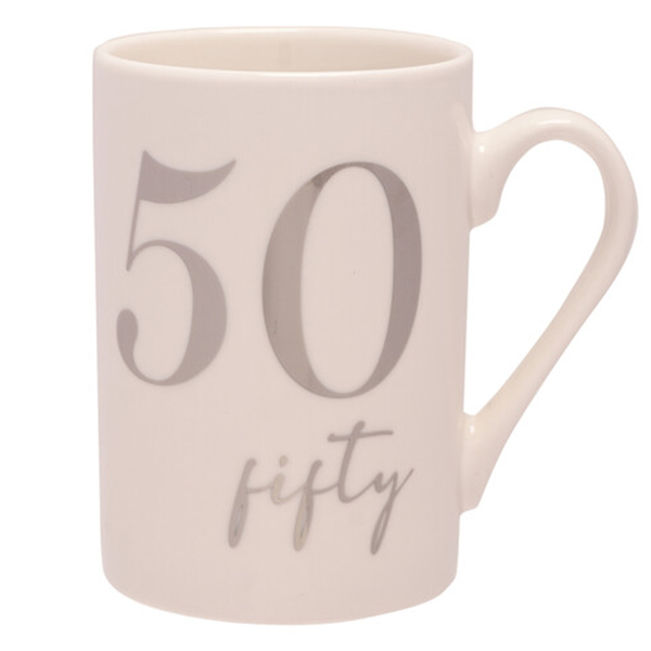 Помогнете на някой специален човек за вас да отпразнува 50 години със стил с тази бяла порцеланова чаша със сребърно фолио.