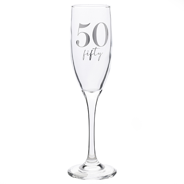 Чаша за шампанско „50-ти рожден ден“ от Milestones by CELEBRATIONS®. Тази семпла, но елегантна чаша е запомнящ се начин да се насладите на шампанско за 50-ти рожден ден. Прозрачната чаша е украсена със сребърен надпис „ 50 Fifty “. Предназначена е за ежедневна употреба или за гордо показване у дома.