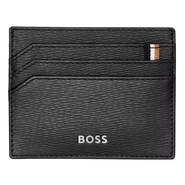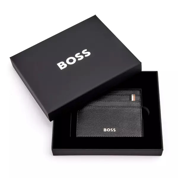 Визитникът се отличава с трицветното текстилно знаме, което украсява повечето артикули от серията Iconic на HUGO BOSS. Изработен от внимателно подбрана текстурирана естествена черна кожа със зърнесто покритие.