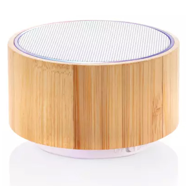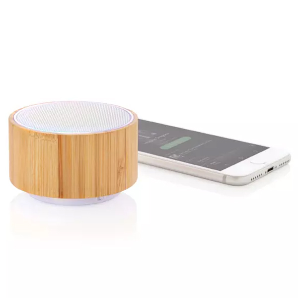 Преносима Bluetooth колонка с бамбуково покритие. Екологичен вариант на стандартната bluetooth колонка, за да промотирате зеленото послание на вашата фирма, което можем да поставим чрез лазерно гравиране или тампонен печат. Има функция за приемане на обаждания, регулиране на звука и FM радио.