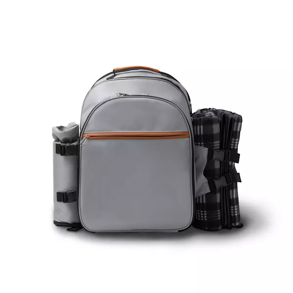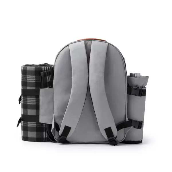 Раница за пикник изработена от RPET полиестер. Основно отделение, включващо: 2 чаши, 2 чинии, 2 комплекта прибори. Едно странично отделение за одеяло за пикник (включено) и едно странично отделение за бутилки.