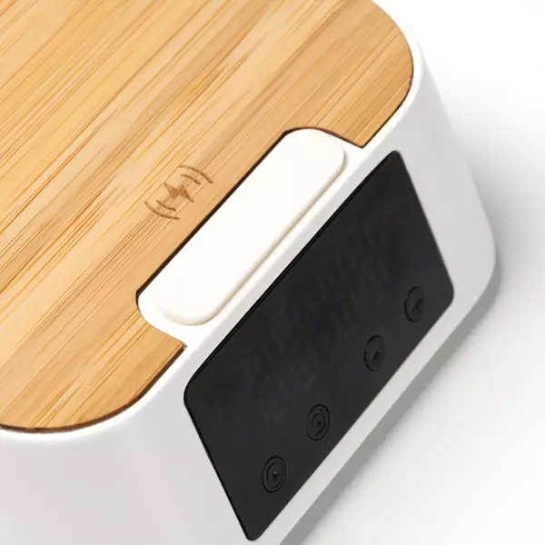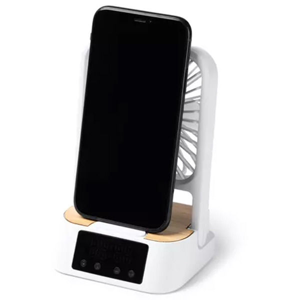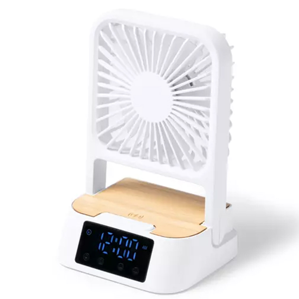 Настолен вентилатор с три режима, вграден часовник и безжично зарядно с мощност 15W. Изработен е от рециклирана ABS пластмаса и бамбук. Включен е USB кабел тип C. Предлага се в кутия с екологичен дизайн.
