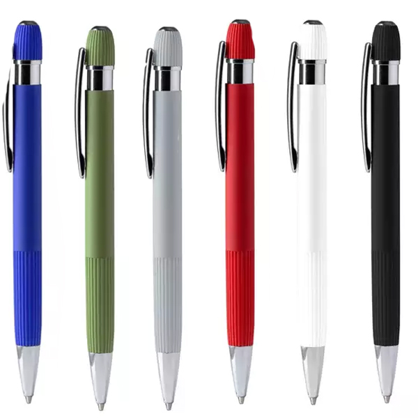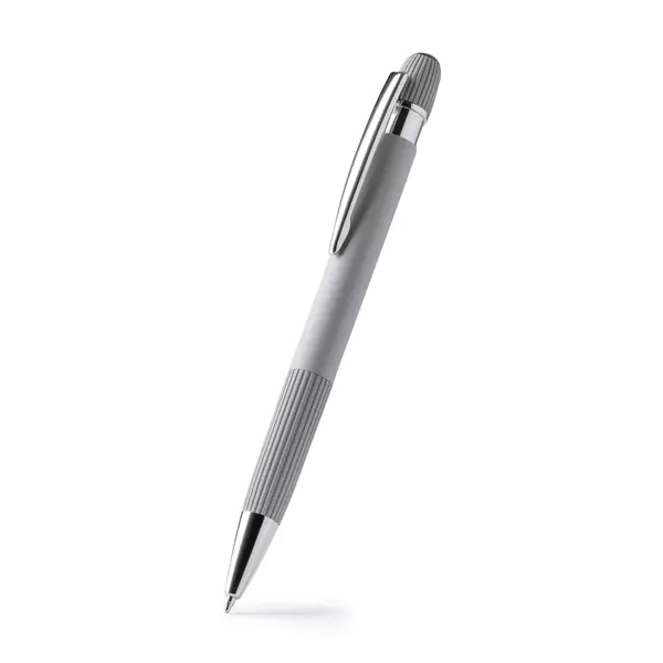 Химикалка от рециклиран алуминий с набраздена повърхност за лесен захват, матово гумено покритие и хромирани елементи.