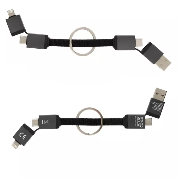 Кабел с ключодържател 4 в 1 с бързо зареждане, изработен от рециклиран RCS TPE, рециклирана алуминиева сплав и рециклиран PET. С USB A и тип C вход и IOS и Type C изход е подходящ за зареждане на много видове артикули. Този кабел с малък размер поддържа 60 W бързо зареждане. Конекторите имат вътрешни магнити, за да ги държат заедно, докато ги носите. Максимален поддържан ток 20V/3A; Опакован в безпластмасов плик.