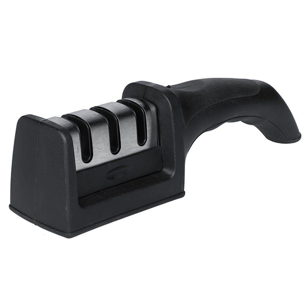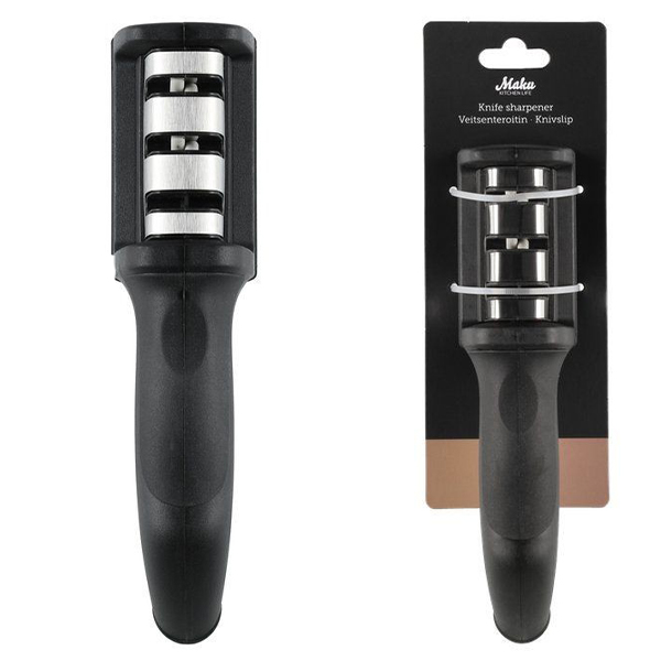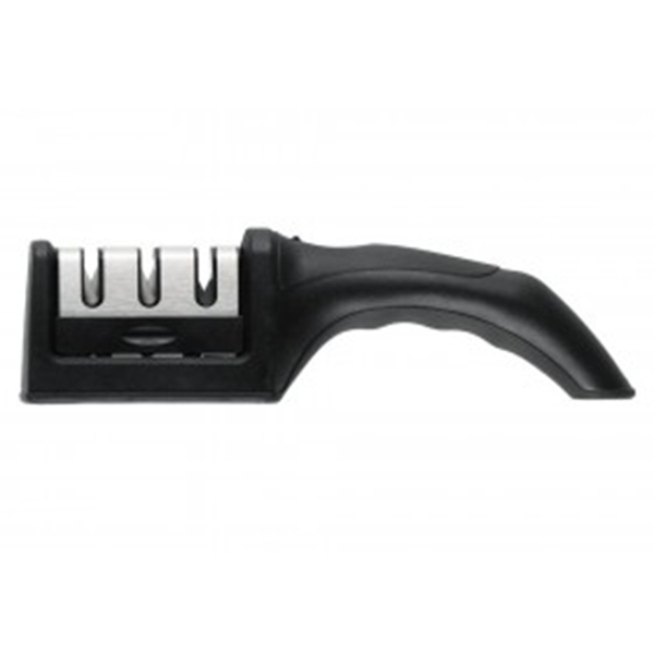 С удобното точило за ножове можете да заточите ножовете бързо и лесно. Точилото има три стъпки: грубо заточване, фино заточване и финално полиране. Дръжката има добър захват, а гумената основа държи точилото здраво на място. Не е подходящо за ножици, керамични ножове или назъбени ножове