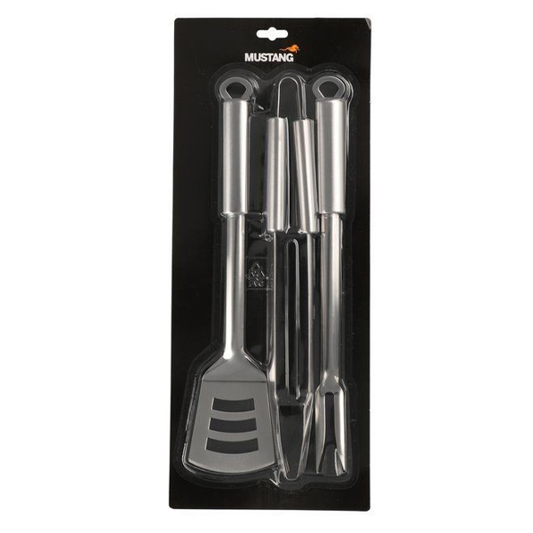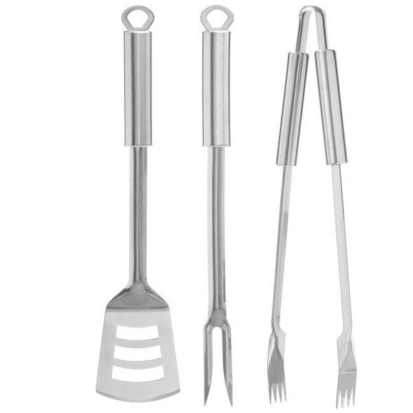 Комплект от 3 части за барбекю с изящен дизайн - щипки, вилица за месо и шпатула. Перфорираните шпатула и щипки позволяват на излишните сокове или мазнина да се отцедят от храната. Кукичките на приборите Ви осигуряват лесно съхранение - директно на Вашето барбекю. Приборите са изработени от неръждаема стомана.