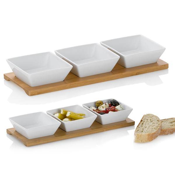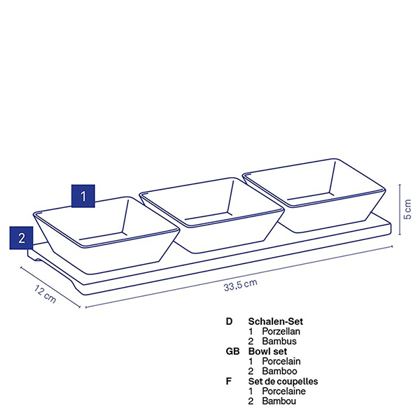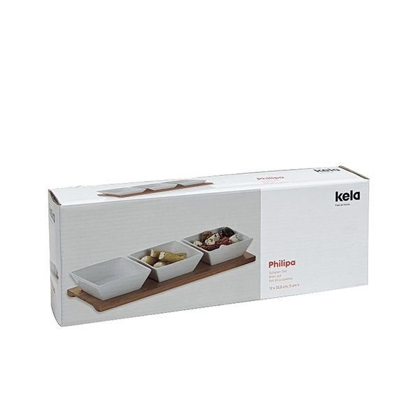 Стилното сервиране на предястия, дипове, ядки, сирена, сосове и десерти не е проблем с комплекта купи Philipa. Дизайнът на поредицата е изчистен и елегантен: главният герой е белият порцелан. Комплектът се състои от поставка, изработена от бамбук, върху която са поставени 3-те купи. Купичките са идеални и за десерти. Благодарение на ненатрапчивия дизайн, този артикул може лесно да се комбинира с други дизайни на сервизи и винаги изглежда добре на масата!