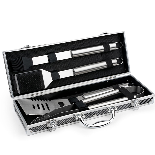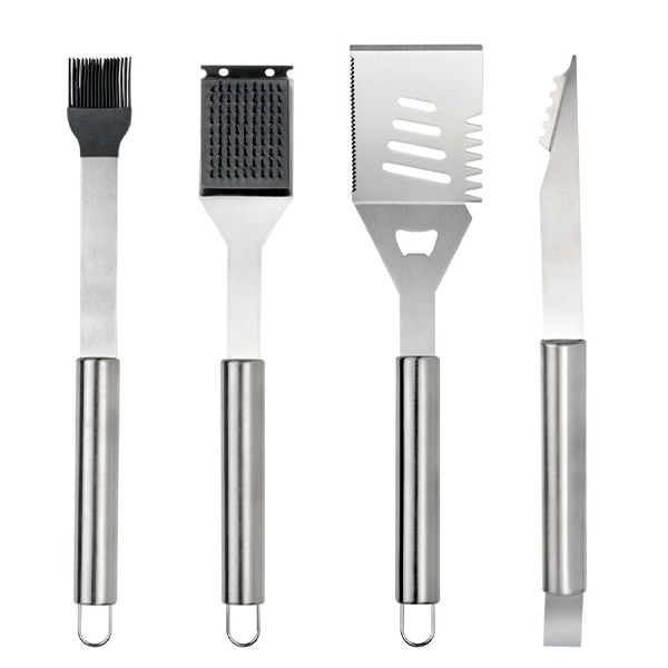 Този комплект съдържа четири основни инструмента за барбекю: щипки, четка за намазняване, шпатула и четка за почистване.