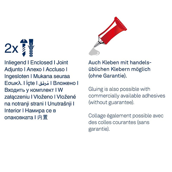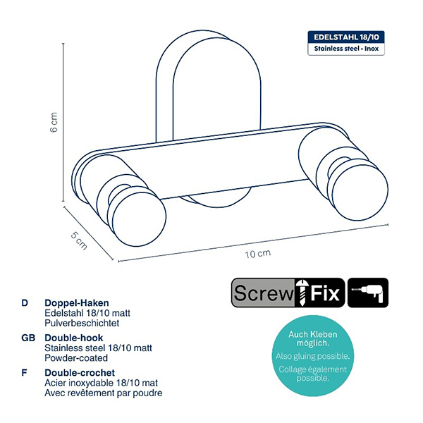Разнообразни опции за монтаж: Можете да монтирате закачалката според вашите предпочитания. Включените в комплекта монтажни елементи позволява лесно закрепване с помощта на винтове. Като алтернатива можете да използвате (предлага се отделно) лепило 22755, за да закрепите закачалката без пробиване