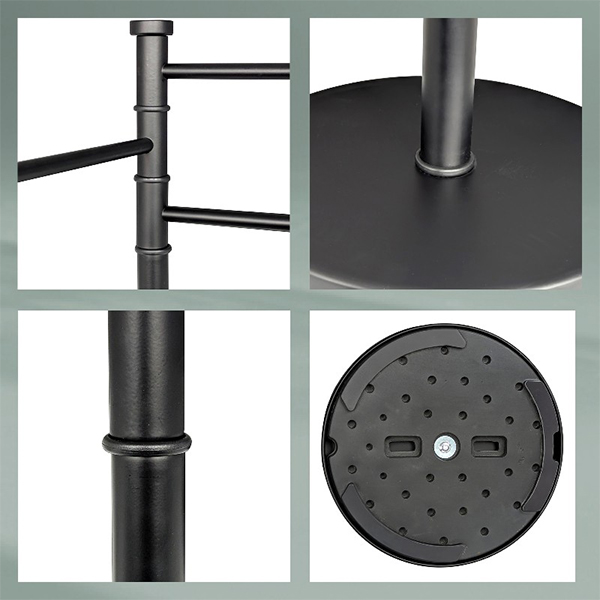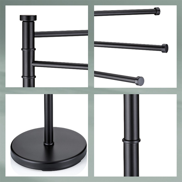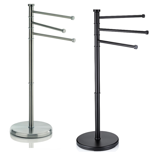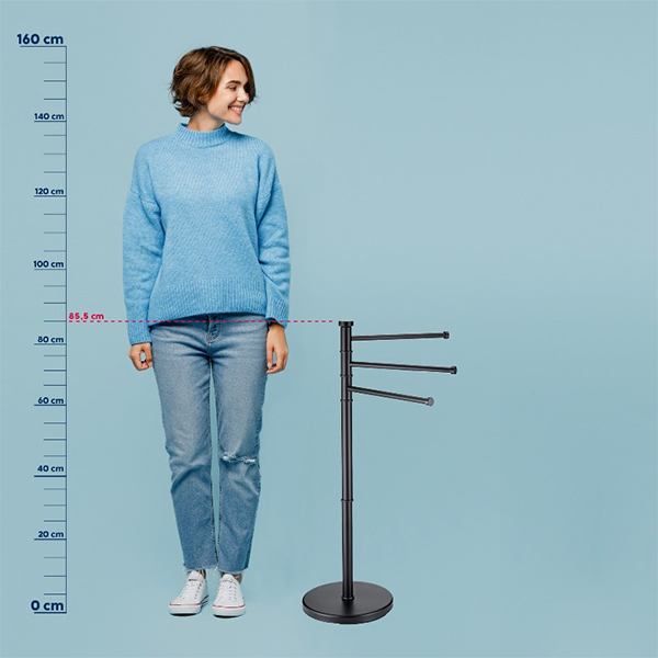 Дизайнът на поставката за кърпи обръща голямо внимание на детайлите, като например впечатляващите крайни капачки на поставките и петте декоративни пръстена. Стойката за кърпи е изработена от висококачествена неръждаема стомана с матово покритие и има кръгла основа с диаметър 28,5 см. Три подвижни поставки за кърпи осигуряват достатъчно място за хавлиите Ви, необходими след душ или къпане. С обща височина от 85,5 см, поставката за кърпи със сигурност е впечатляваща.